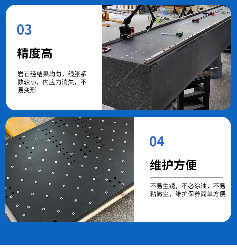 3选择花岗岩平板花岗岩平台的理由:取材於地下优质的岩石层,经过亿万年自然时效,形态极为稳定,不用担心因常规的温差而发生变形。抗压强度达2290-3750公斤/平方厘米,硬度达莫氏硬度6-7级。极耐磨损、耐酸、耐碱,有很高的耐腐蚀性,永远不会生锈。其硬度比铸铁高2-3倍(相当於HRC>51),因此精度保持性好。在使用中岩石工具即使遭重物磕碰,至多掉几粒石碴而已,而不会像金属工具那样,因变形而破坏精度。其优於优质铸铁和钢材制作的精密测量基准零件,可以获得高而稳定的精度。